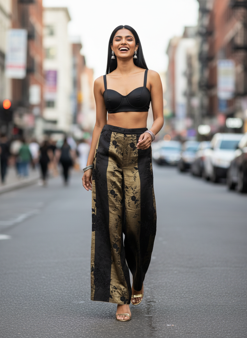a chanderi high-waisted, wide-leg trousers with alternating vertical panels of matte black and metallic antique gold, featuring intricate black floral embroidery throughout, ankle-length with a softly flared silhouette, made from glossy embroidered fabric