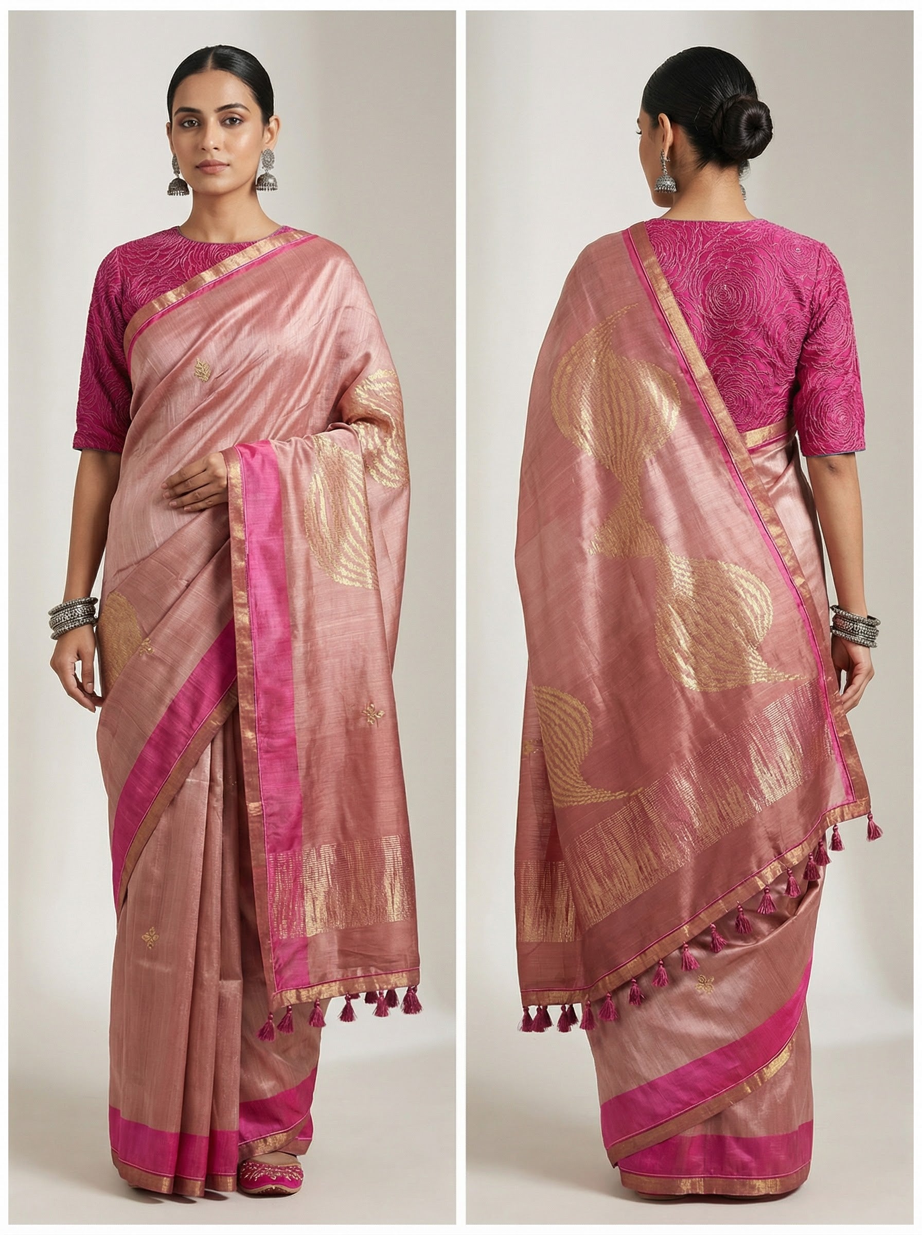 A model wearing a soft pink silk saree with golden zari woven motifs and a contrasting bright magenta pallu adorned with gold embroidery and tassels, paired with a magenta blouse featuring gold accents and subtle geometric patterns.