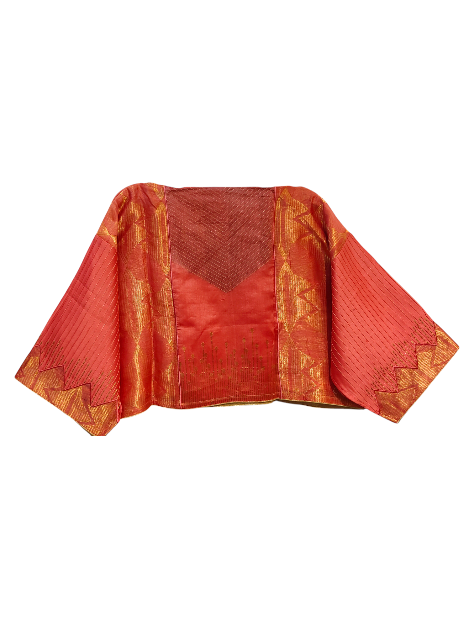 A full-length ombré silk saree in vibrant shades of yellow, coral, and pink with subtle golden zari detailing and a wide shimmering border, paired with a bright orange elbow-sleeve blouse featuring gold woven zigzag cuffs and chevron-stitched back panel