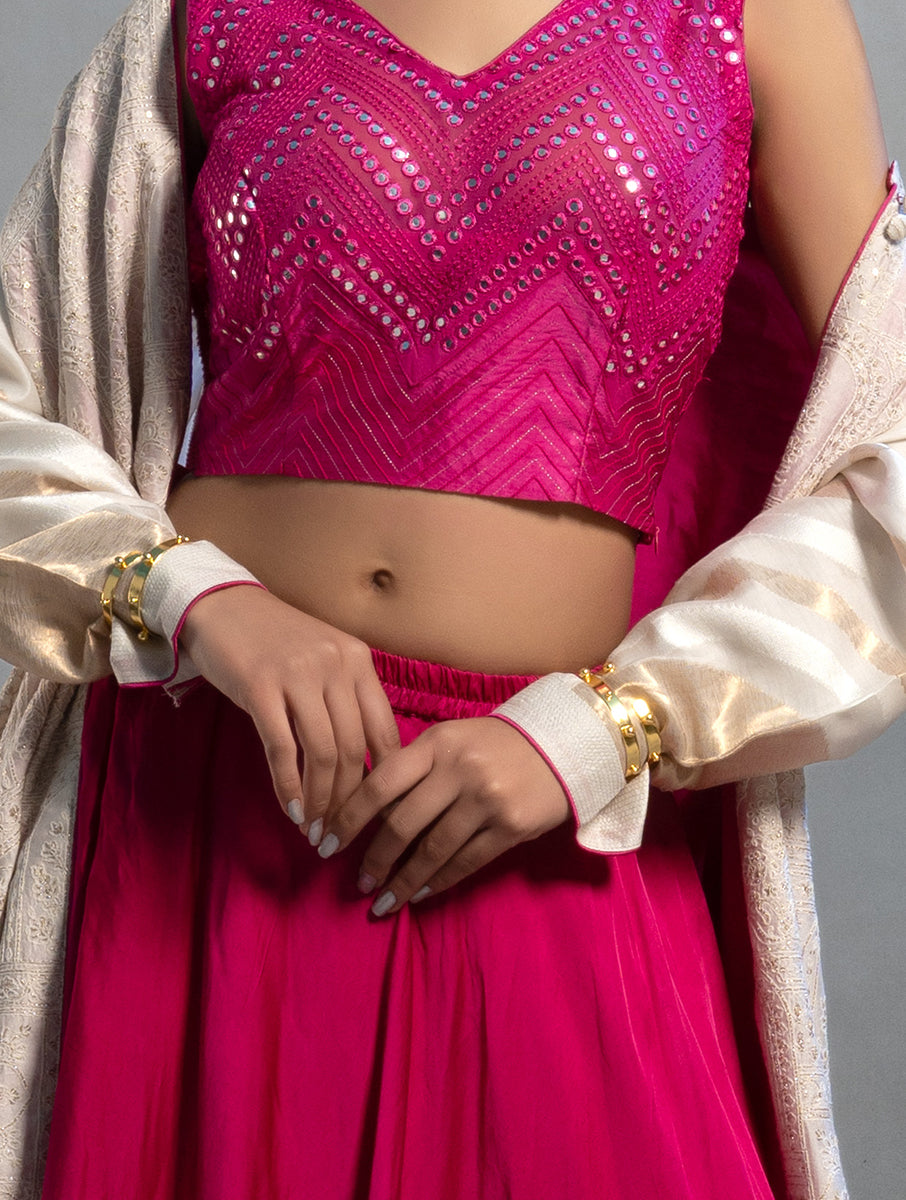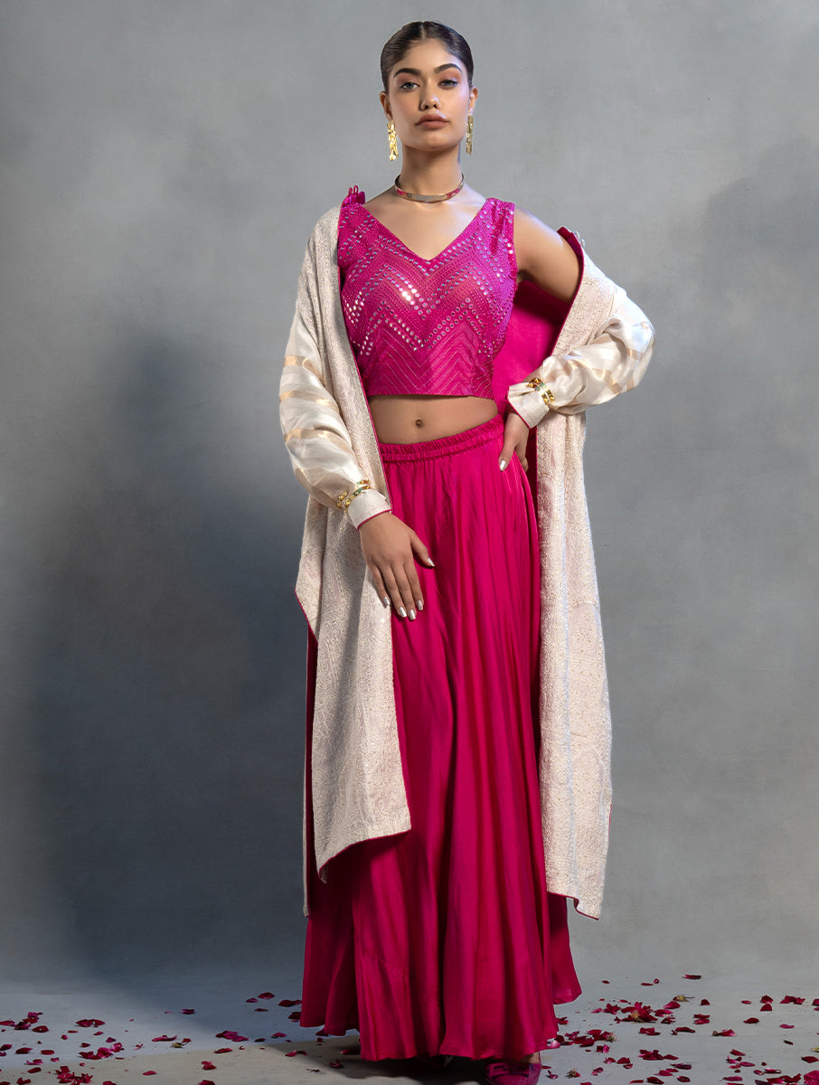 This formal ensemble comprises of a modal satin umbrella skirt with a 5mt ghera coordinated with a mirrorwork ranipink georgette blouse has been coordinated with a lovely gold and natural white duster jacket with a zari woven buta at the back in mughal theme for a royal effect