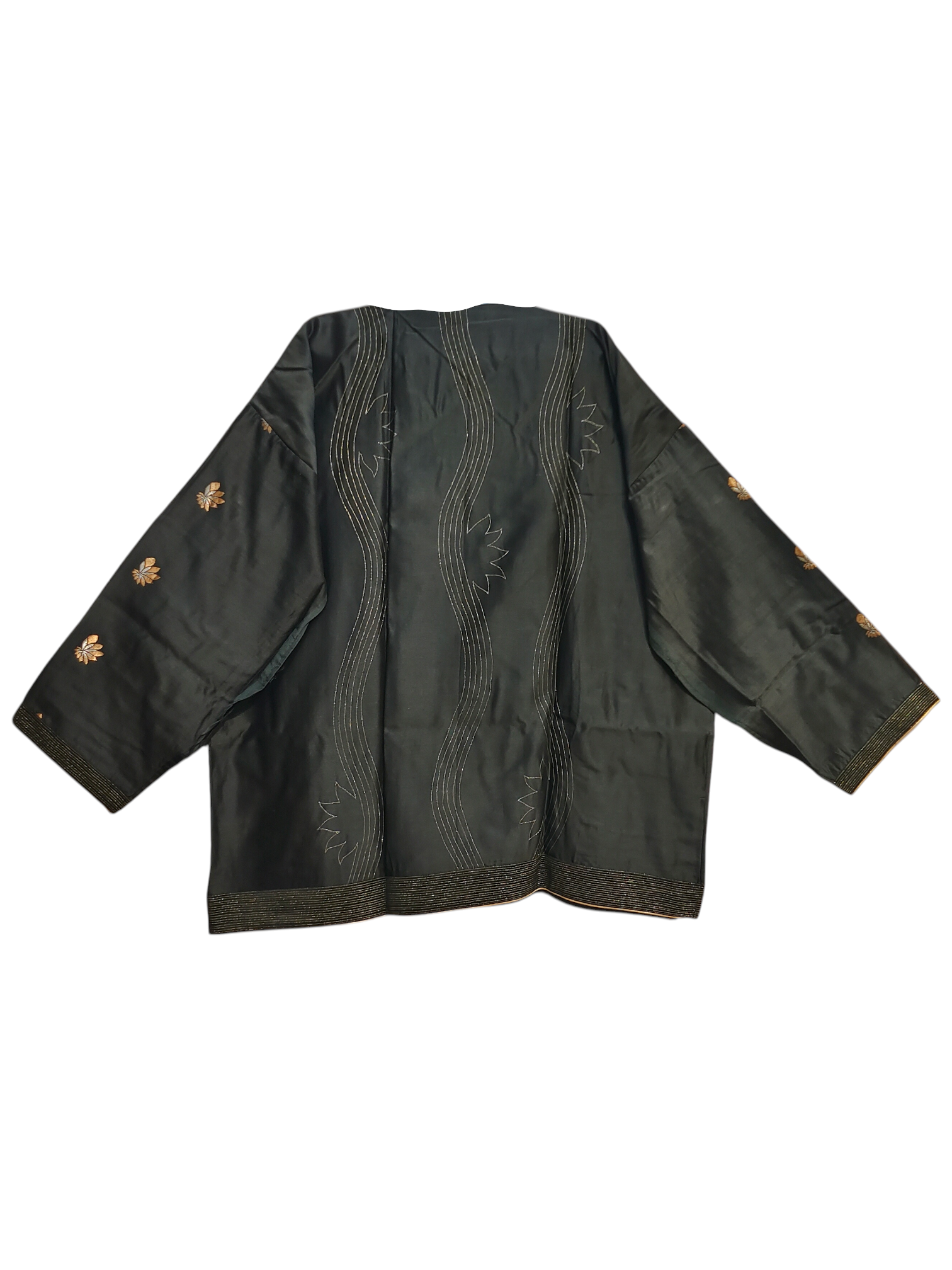 A cropped black silk mid hip length tunic with front and back panel of same length with golden embroidery on the back panel and floral motifs on the sleeves, featuring intricate zari detailing on the hem and cuffs, and a big medaalion motif in the front yoke area in gold weaving paired with wide-leg high-waisted striped palazzo pants in alternating black and metallic gold brocade with floral jacquard pattern