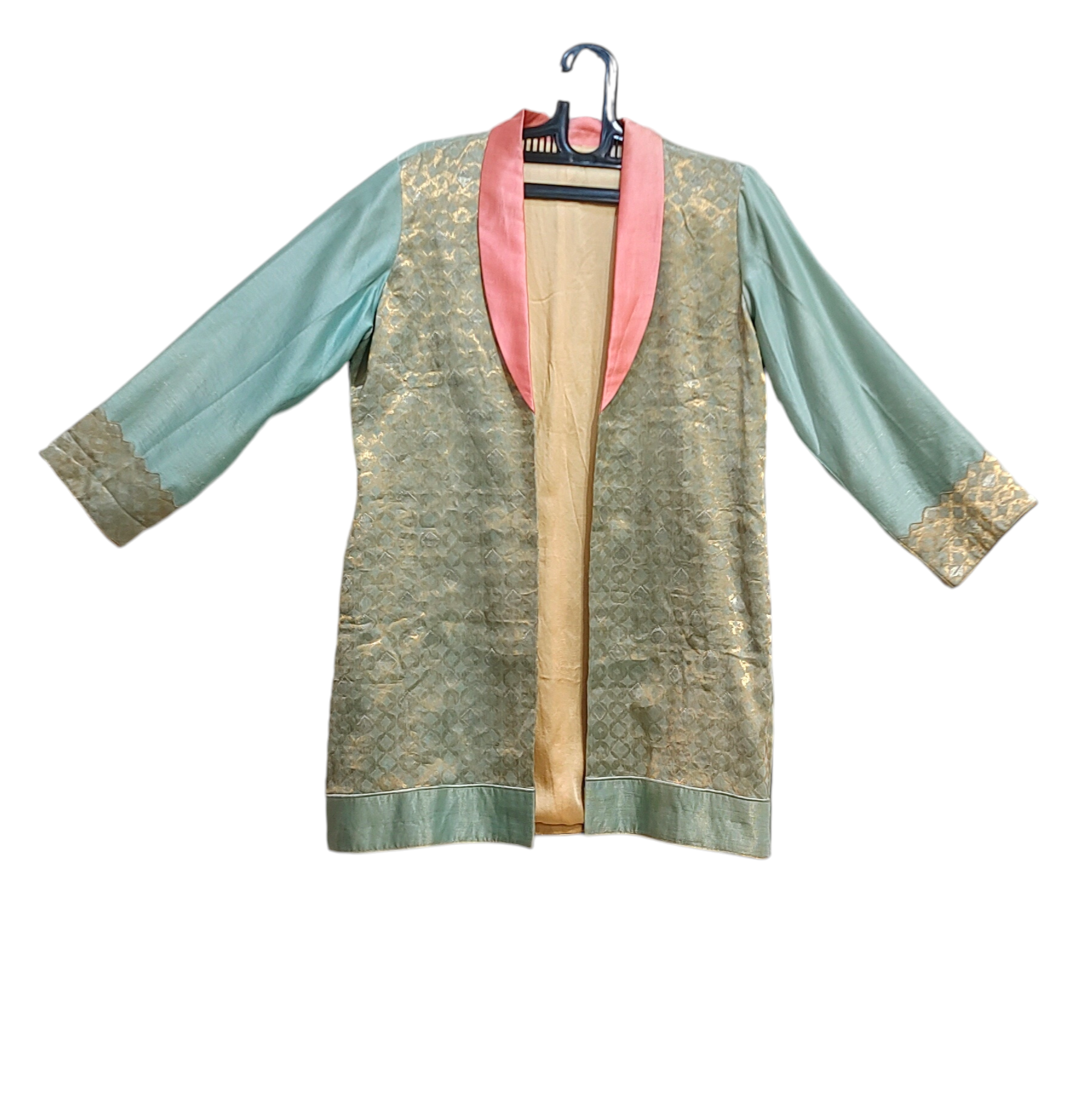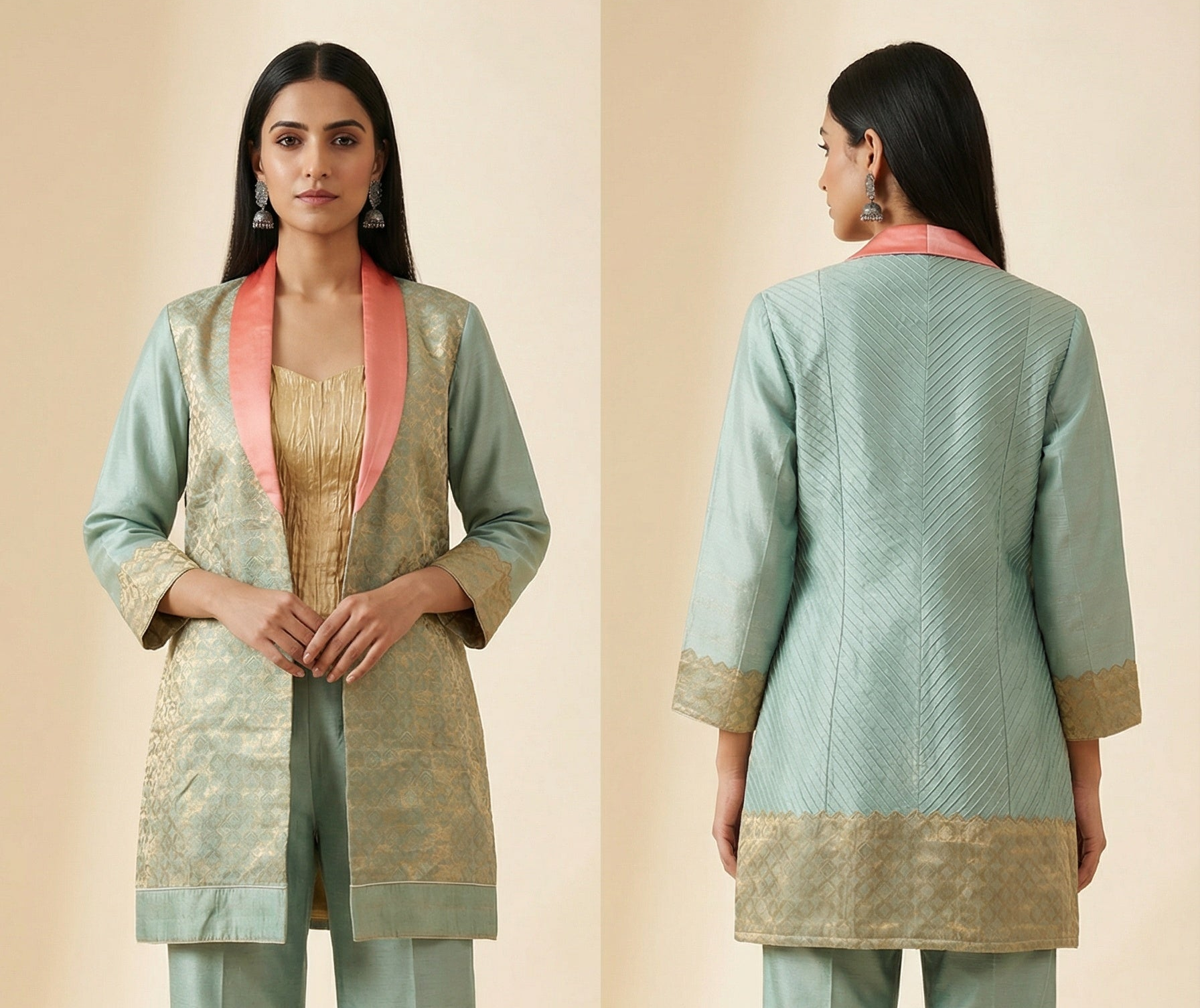 A mid-thigh length seafoam green silk brocade jacket with metallic gold woven detailing on the front panel, cuffs, and hem, featuring a coral pink satin shawl collar and an open front design, three-quarter sleeves with intricate texture, clean minimalistic fashion editorial, in the style of a contemporary South Asian luxury lookbook.. Worn with a golden crinkeled tissue sleeveless plain satin silk corset inside the coat and a seafoam green matching flared plazzo pant with golden shimmer around the bottom hem