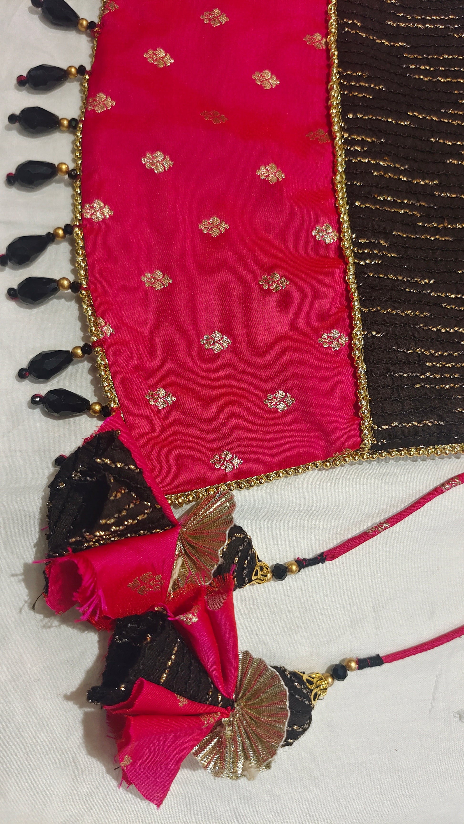 The potli features a rich black textured Chanderi silk body with subtle metallic striping, contrasted with a deep ruby Banarasi silk base woven with delicate gold butis. Finished with handcrafted tassels, bead fringes, and an embroidered handle, the design reflects refined artisanal detailing.