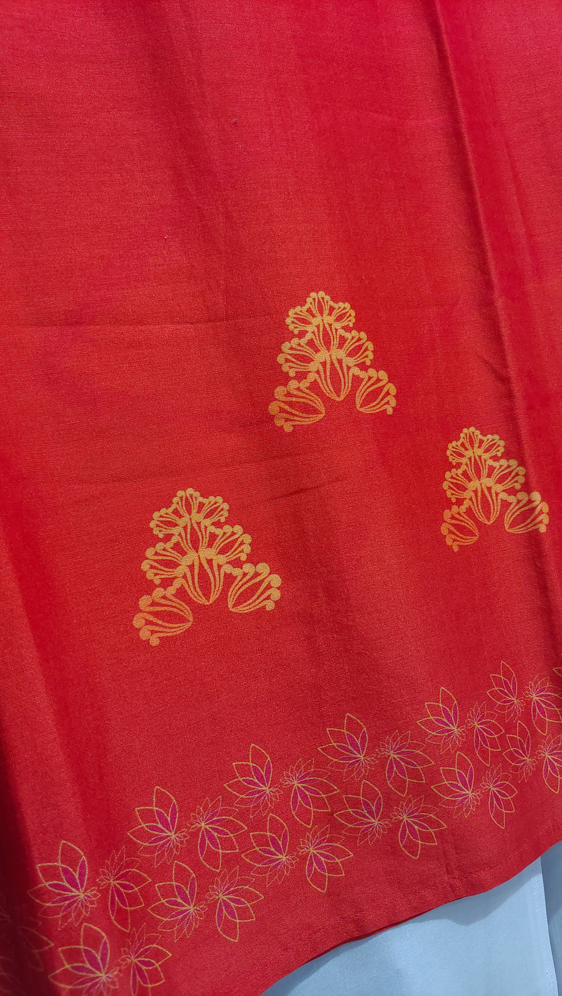 A bright flared knee-length A-line kurta in mustard yellow with bold red side panels and sleeves, featuring golden embroidery on the sleeves and neckline, paired with a sleeveless inner dress in deep red with yellow floral embroidery and an ombré gradient effect, finished with a subtle gold border, can be customise dto various sizes