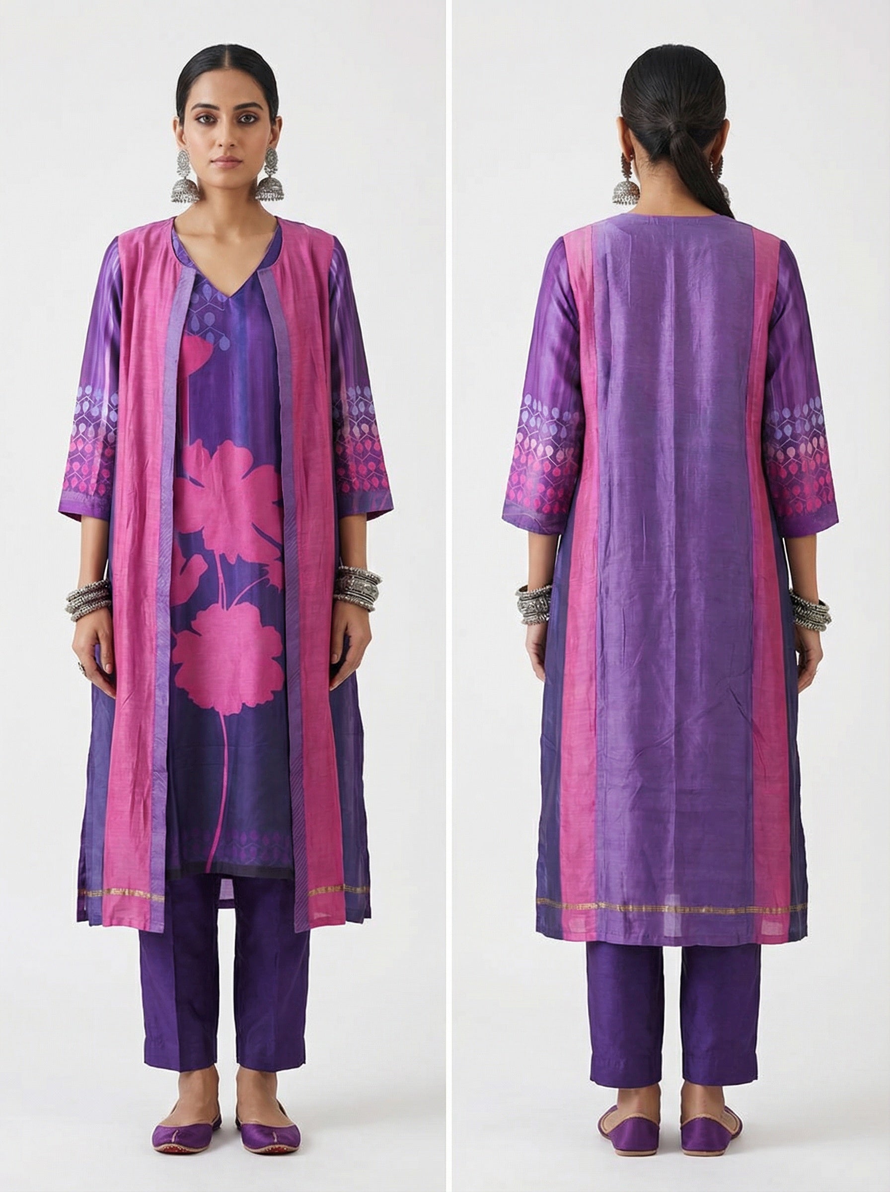 a knee-length sleeveless silk dress in a deep purple-to-magenta gradient with large bold pink floral print and petal motifs, layered under a coordinating long open-front jacket with elbow-length sleeves, striped color-blocked panels in pink and violet, and geometric accents on the sleeves