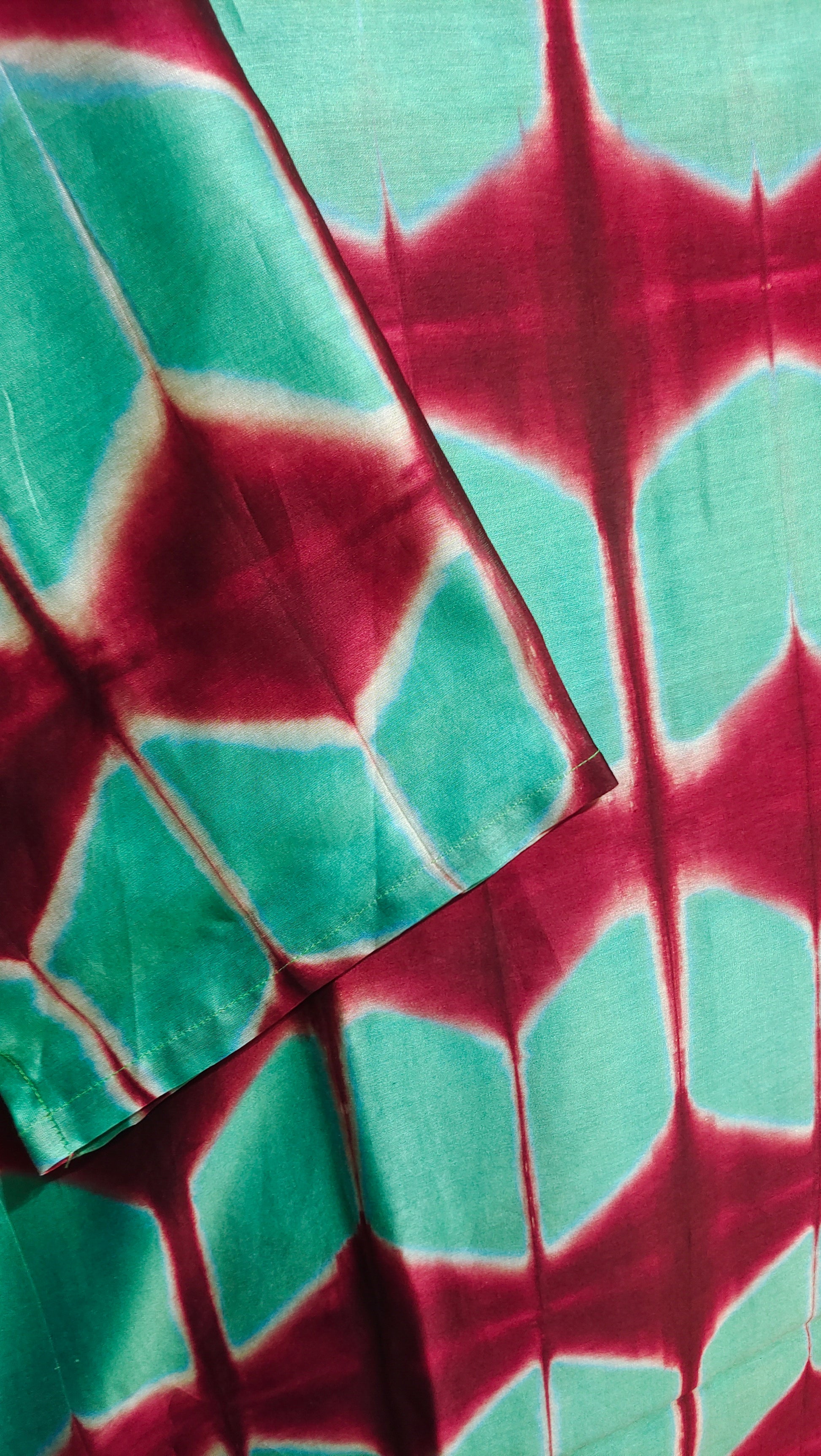 A long straight-cut chanderi silk kurta with three fourth length sleeves, featuring a bold geometric tie-dye pattern in emerald green and deep maroon with symmetrical hexagonal motifs; clean minimal fashion product photo, statement textile focus, posed in sharp daylight with modern posture..kurta is 48 inch maximum in length but can be shortened as per requirement as there is no neckline .The single side ghera is 32 inch so sizes upto 5XL are possible to get tailored in this material.