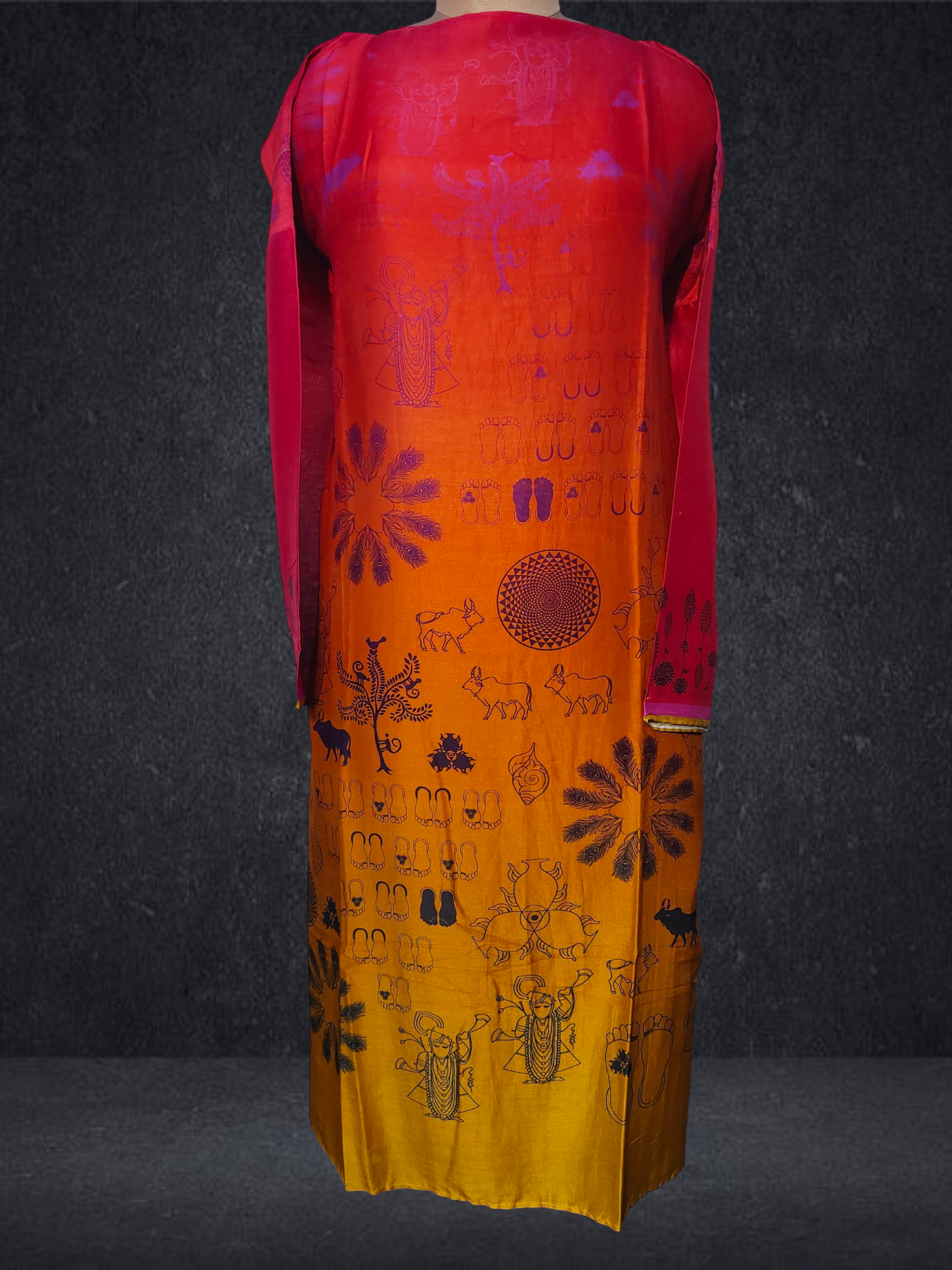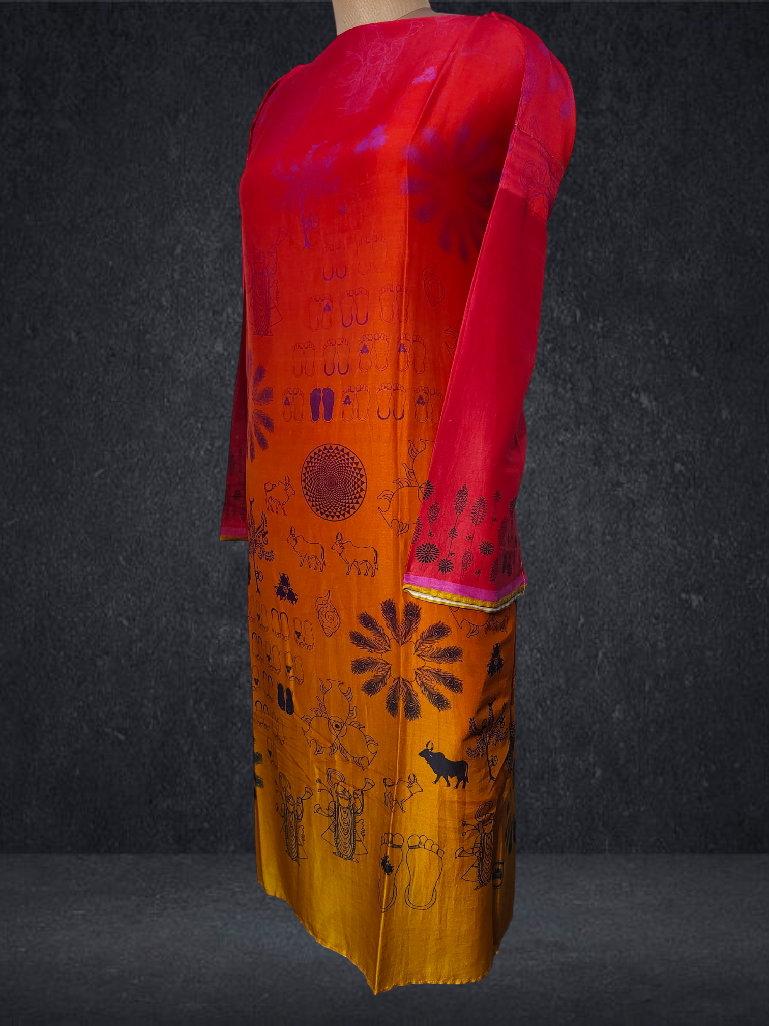 A cotton modal straight-cut, calf-length silk dress with long sleeves, in a vivid gradient of deep magenta to saffron orange, adorned with intricate tribal-style black and indigo motifs of deities, footprints, florals, and cattle, clean minimal fashion product photo, bold folkloric textile statement