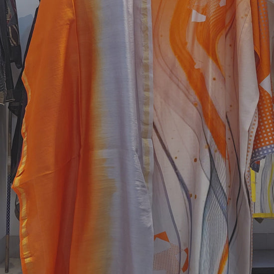 The kurta is designed in contemporary abstract prints in modern themes printed on 80 gsm chanderi fabric giving a very luxurious feel and handle to the kurta.This kurta is 48 inch maximum in length but can be shortened as per requirement as there is no neckline .The single side ghera is 34 inch so sizes upto 5XL are possible to get tailored in this material.