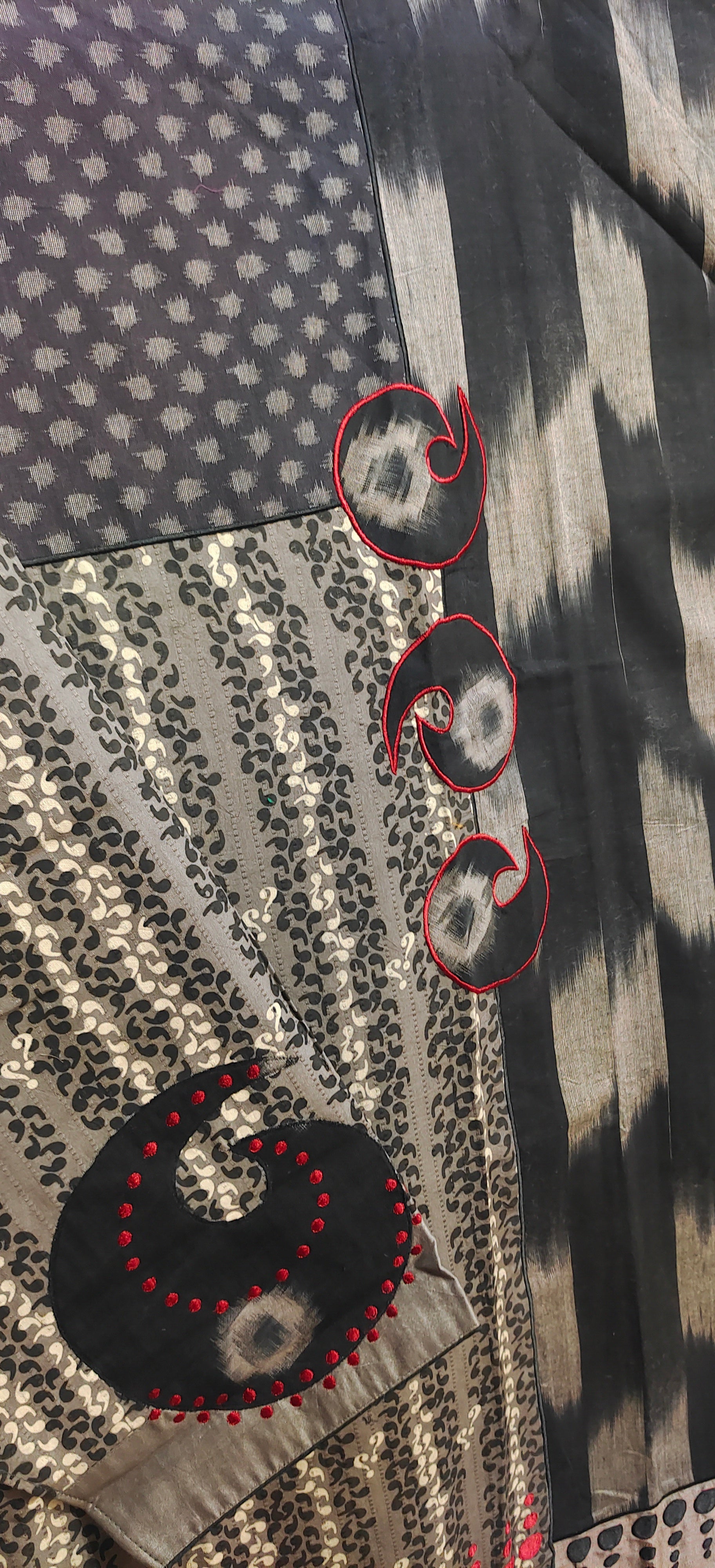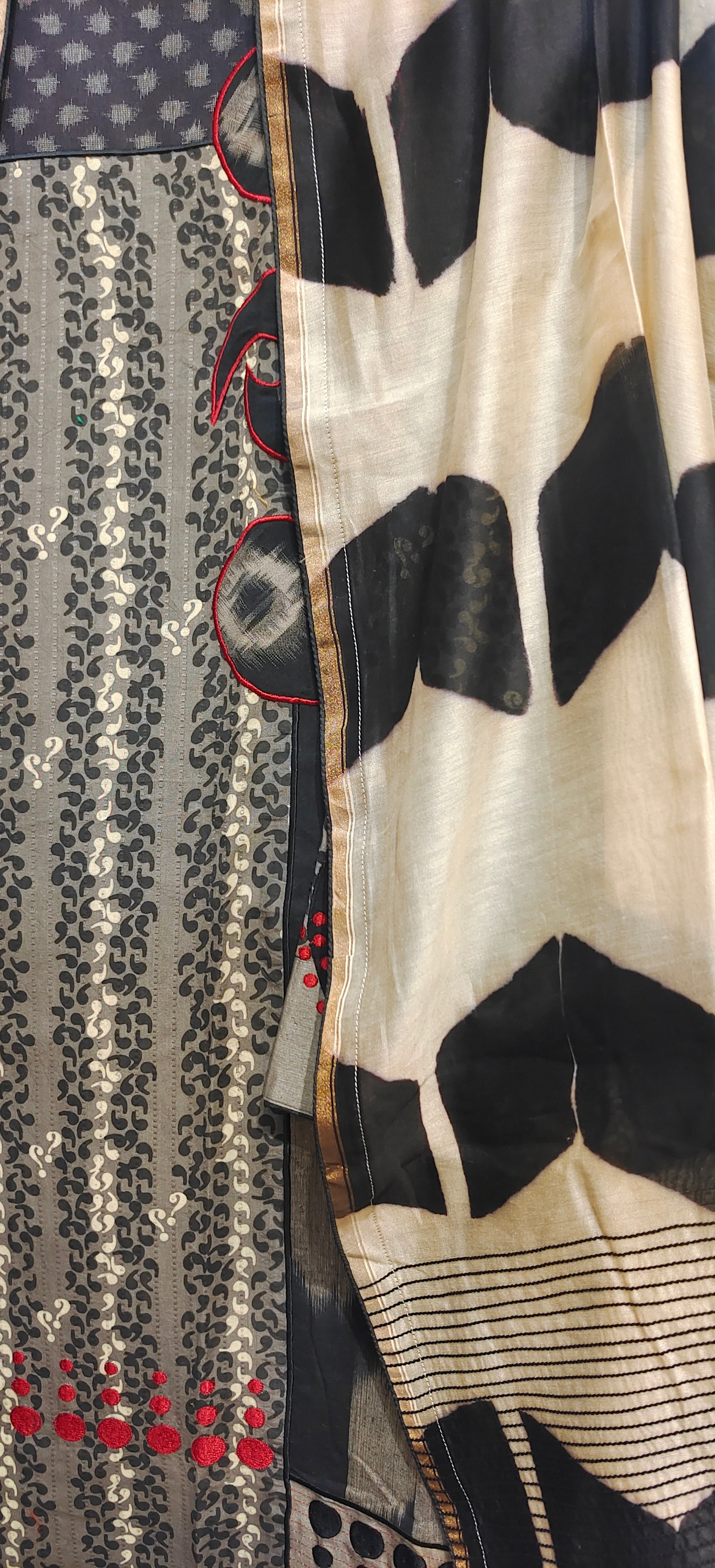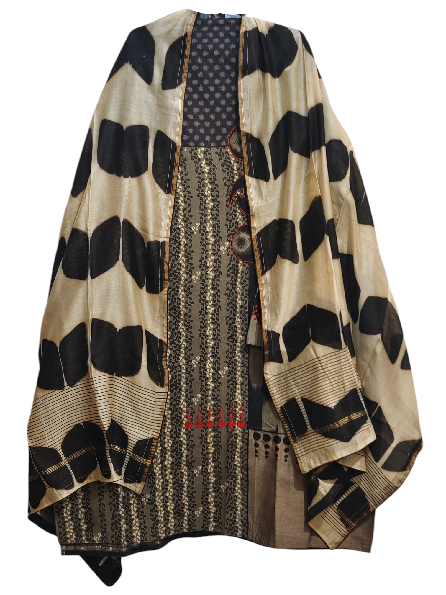 This 3 pc suitset features a mid calf-length kurta in earthy beige and black patchwork print with vertical tribal motifs and contrasting grey polka dot panels, featuring circular black and red embroidered accents on the wide sleeves, styled with a bold cream and black geometric printed dupatta with gold edging, clean minimal background.