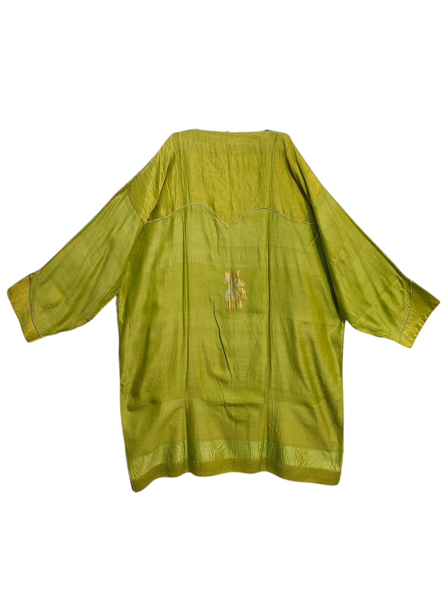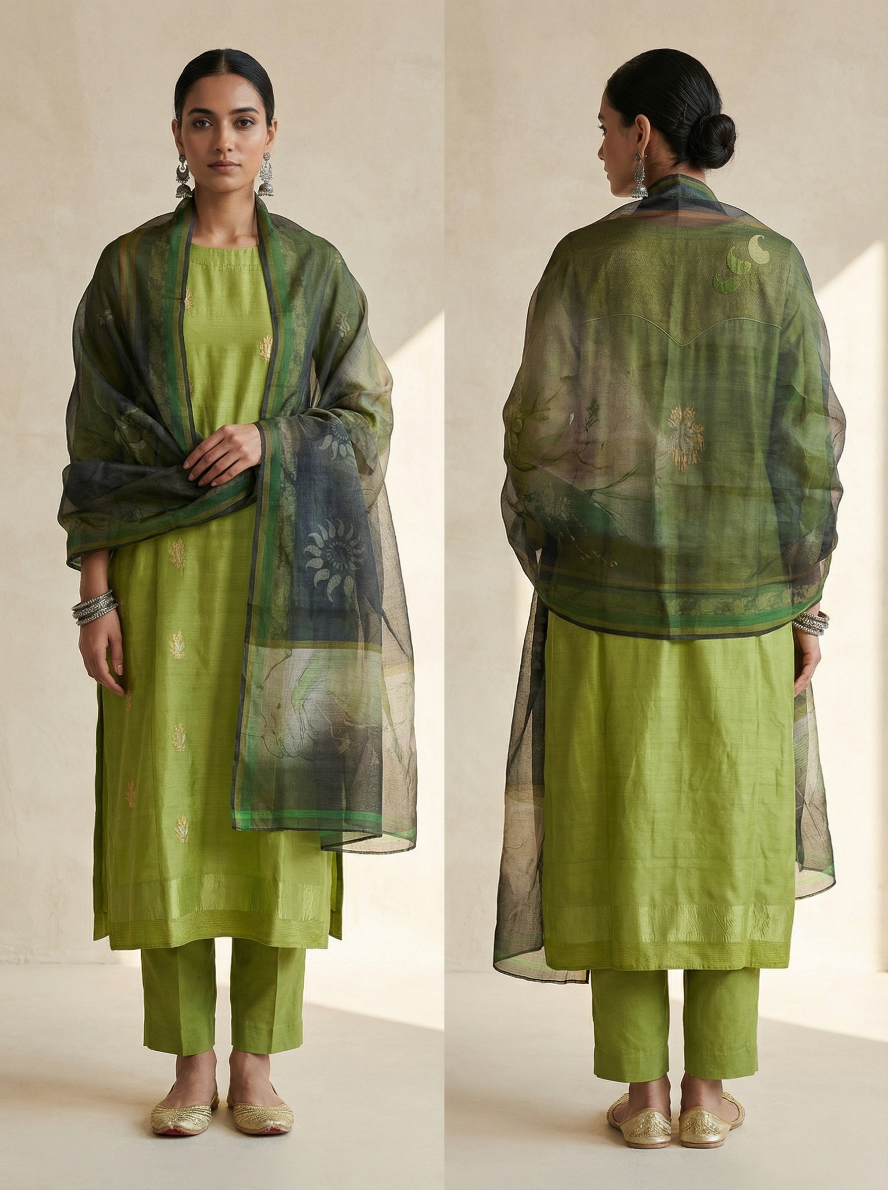 A long parrot green silk kurta with subtle sheen and gold buti embroidery, styled with a sheer organza dupatta in a moody olive and charcoal gradient featuring abstract floral motifs and a wide green border