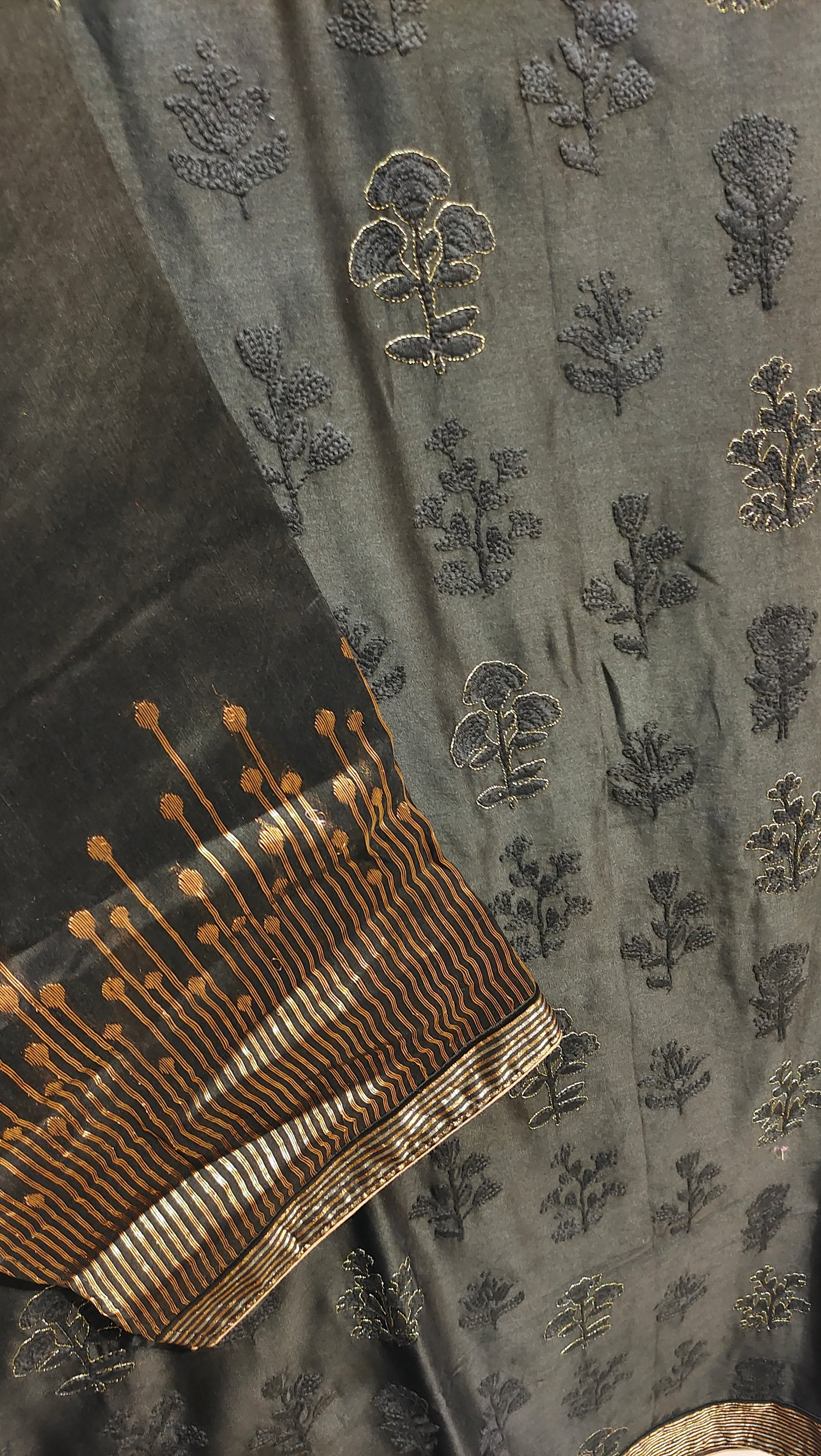 A black silk chanderi calf length kurta with intricate gold floral buti embroidery, copper zari cuffs, and a lustrous hem, layered with a sheer ivory organza overlay featuring bold black swirling floral prints and a sharp red border.