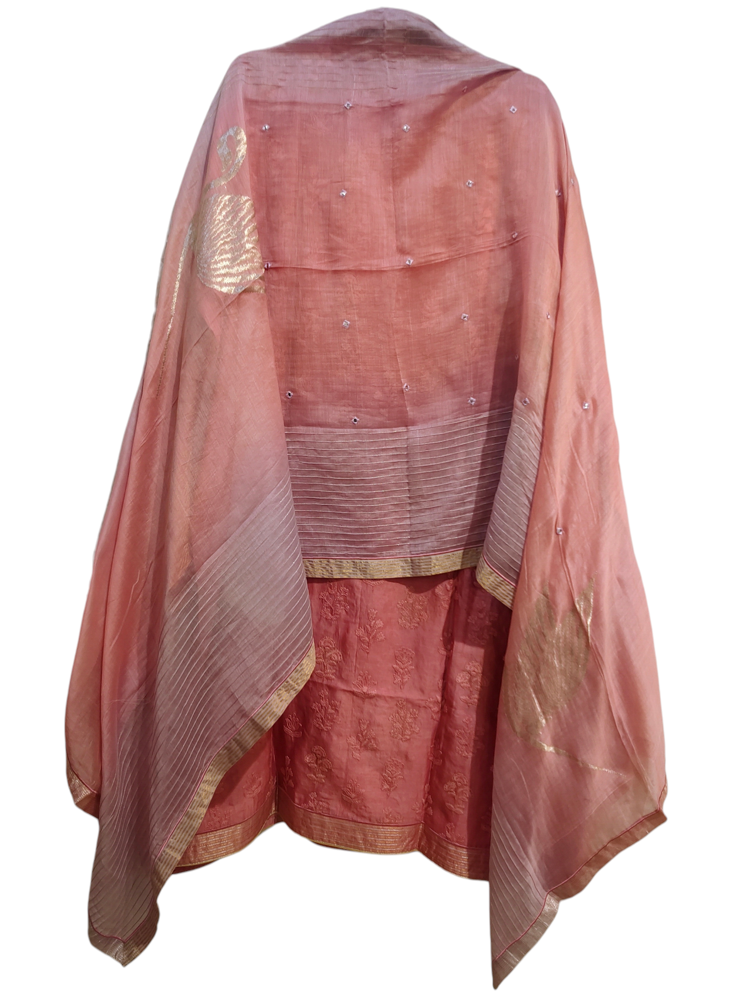 The dupatta measures 2.5 meters in length and 38 inches in width.The ensemble is provided with a matching cotton satin bottom material for 2.5 mts.