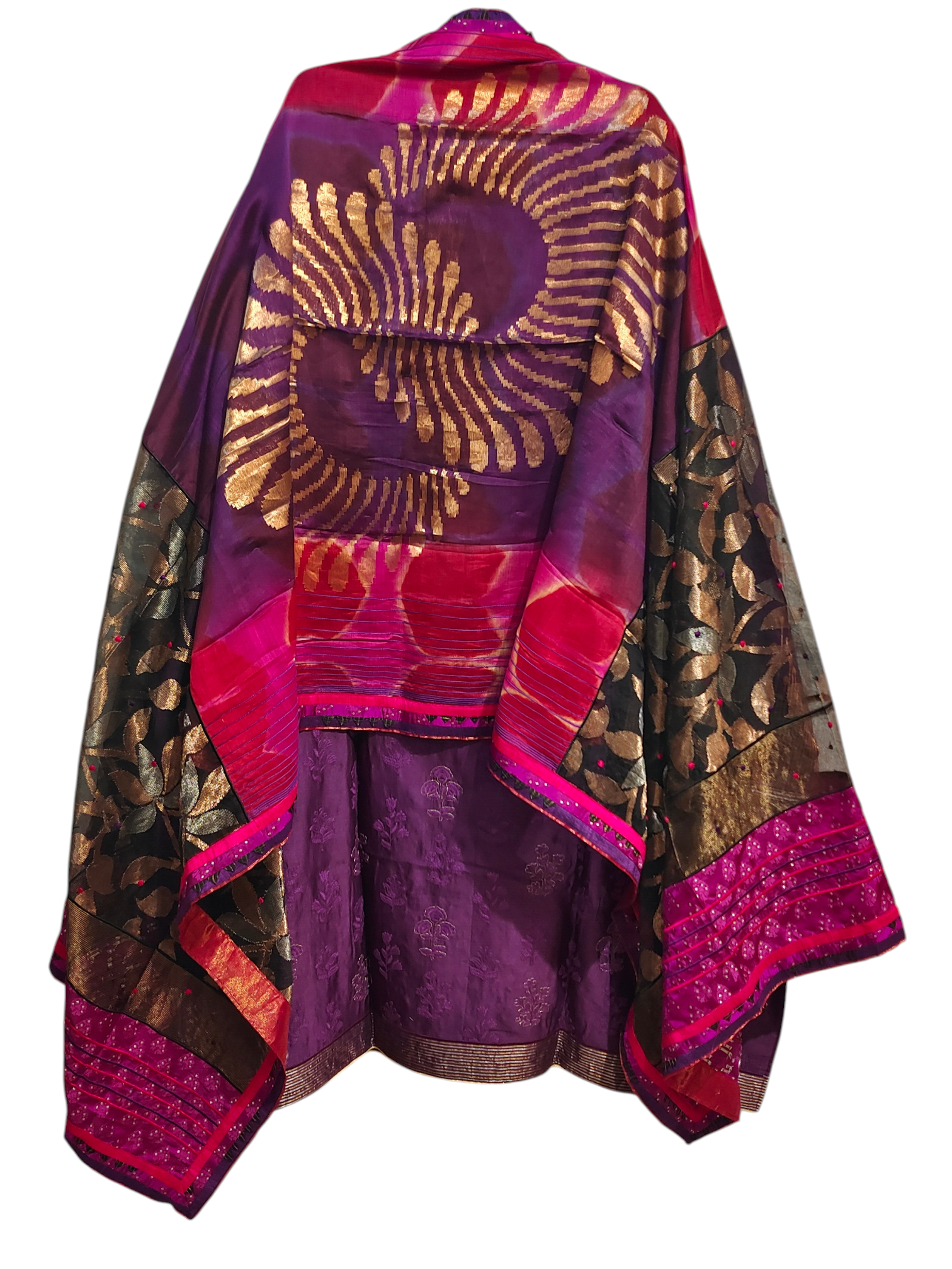 A deep violet silk kurta with an A-line silhouette, intricately woven with tonal floral brocade motifs and metallic copper edging at the hem and sleeves. Styled with an opulent silk dupatta featuring a striking magenta and red striped pattern transitioning into black with bold gold leaf motifs, and embellished with zari detailing and fuchsia embroidered accents