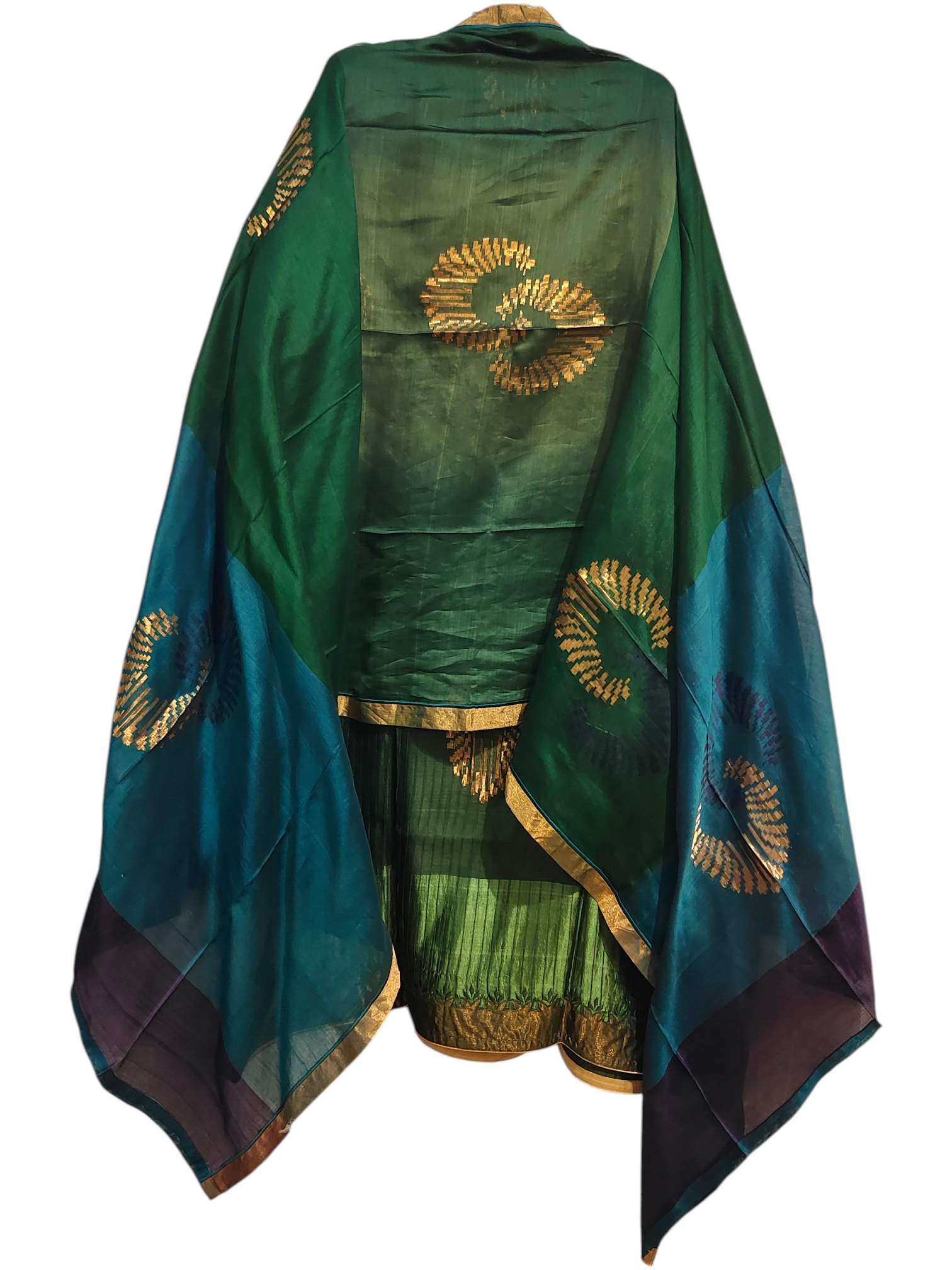 A rich emerald green straight-cut silk kurta with vertical pintuck detailing, gold zari sleeve panels, and geometric circular gold embroidery. Paired with a sheer teal and green ombré dupatta featuring large abstract gold motifs and a shimmering gold border
