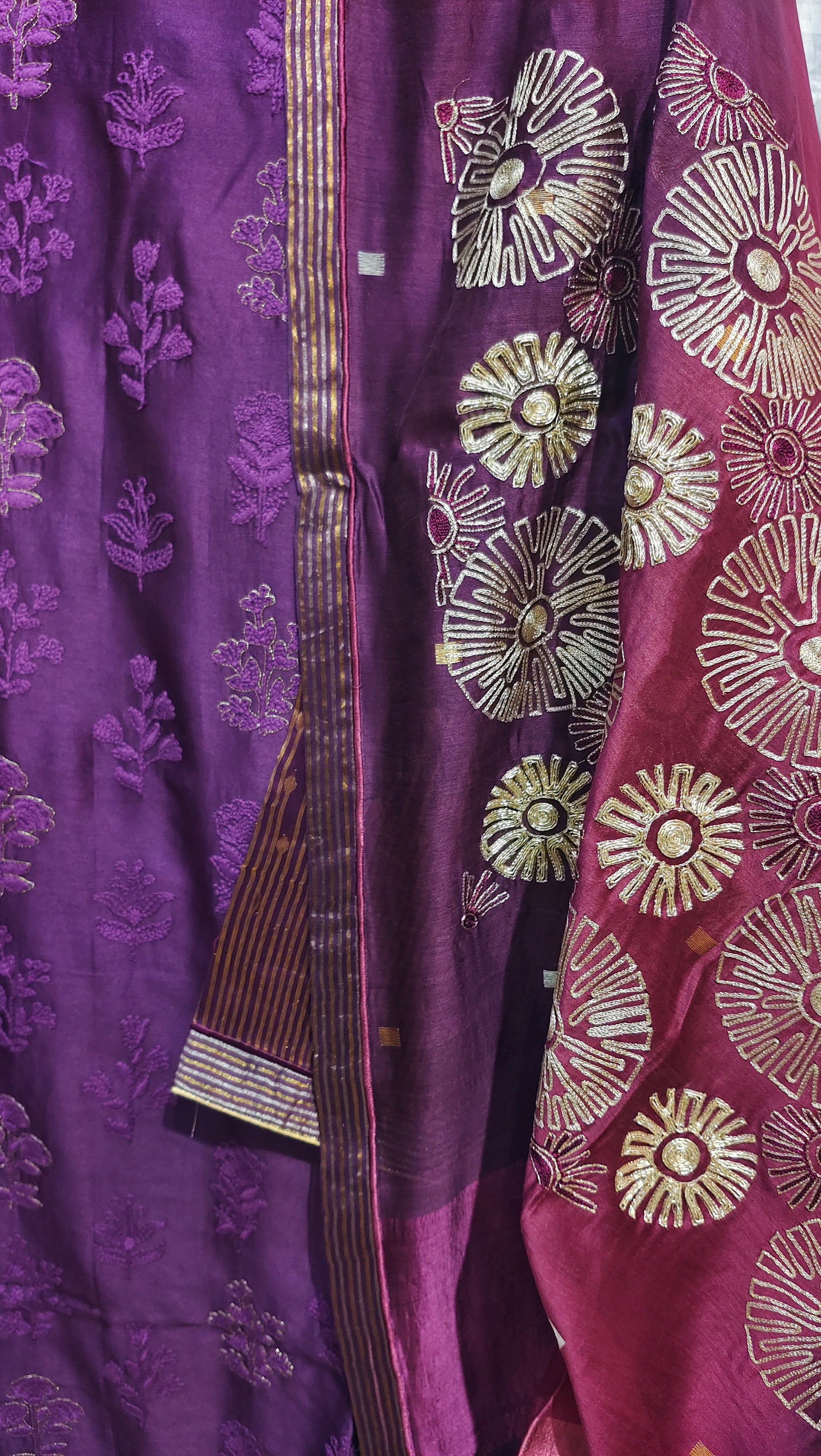 A deep plum straight-cut silk kurta with all-over tonal floral jacquard and metallic copper embroidered cuffs, paired with a rich wine-toned ombré dupatta adorned with large gold and ivory circular floral motifs and tiny mirror embellishments.