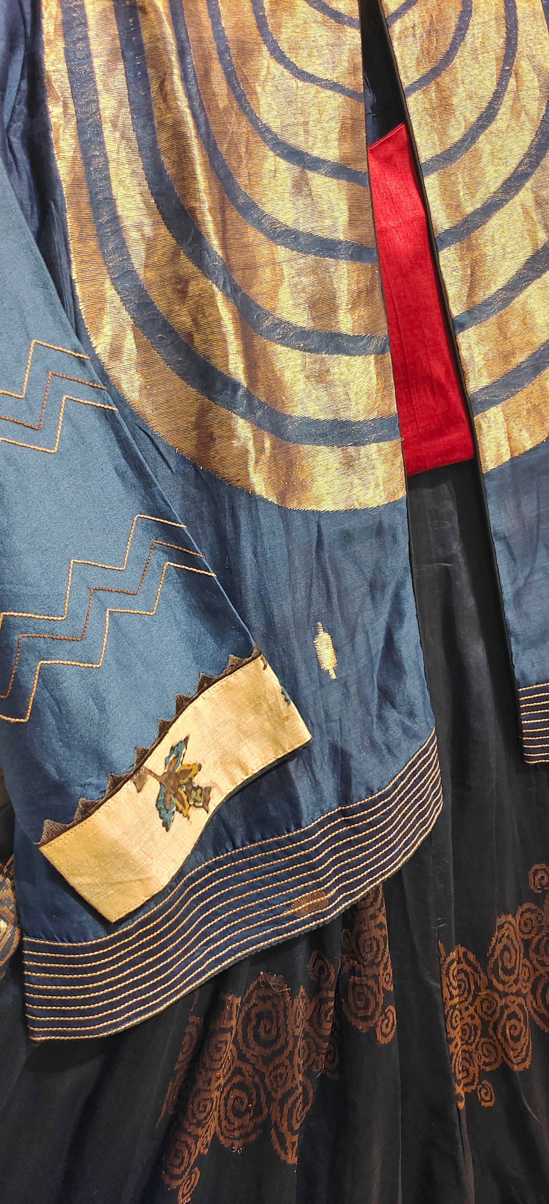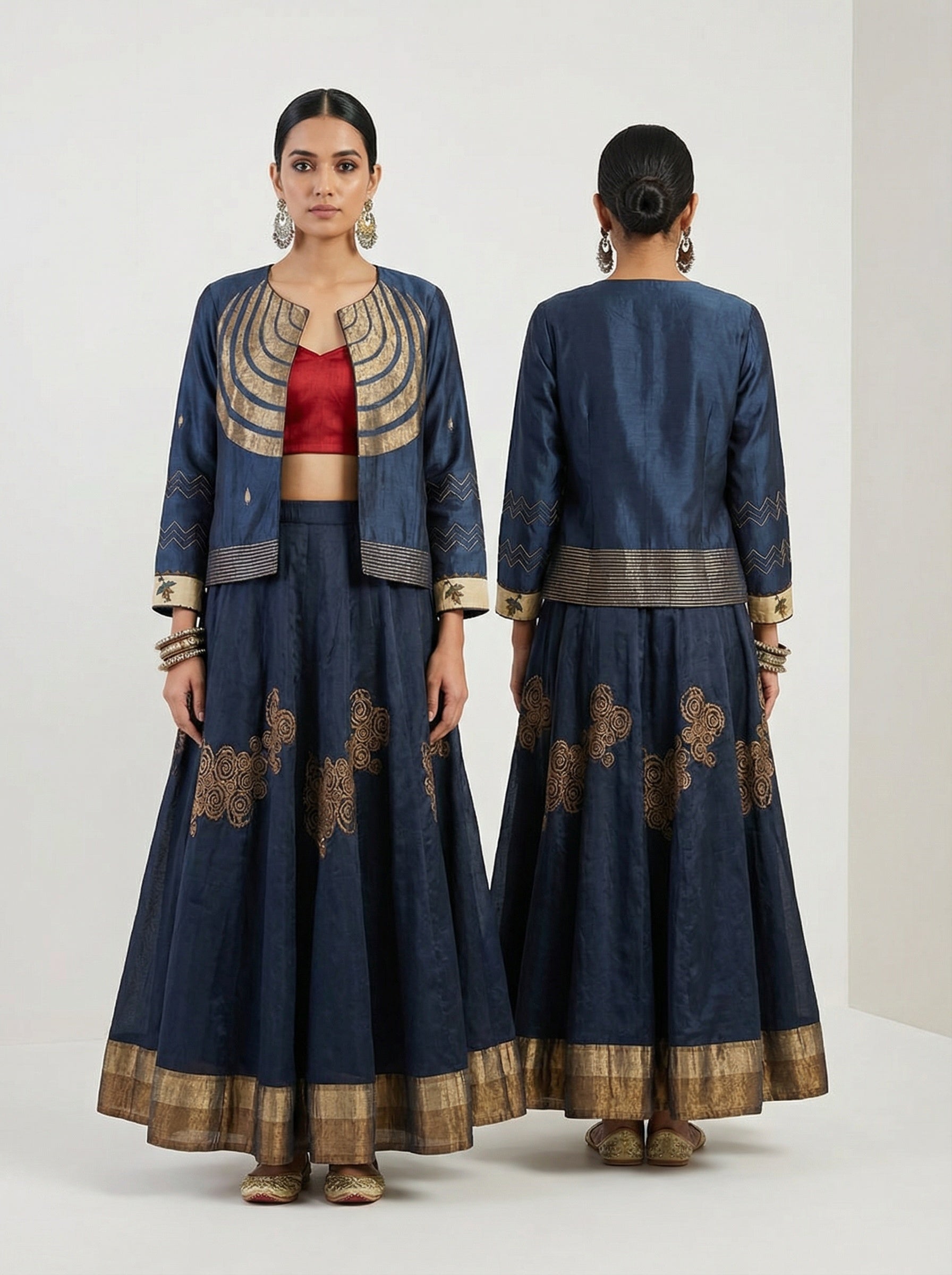 A traditional deep navy silk lehenga set with a flared ankle-length skirt featuring gold circular embroidery and a broad metallic gold border, paired with a fitted red bustier blouse and a structured navy cropped jacket with gold concentric detailing, zigzag sleeve embroidery, and cream embroidered cuffs