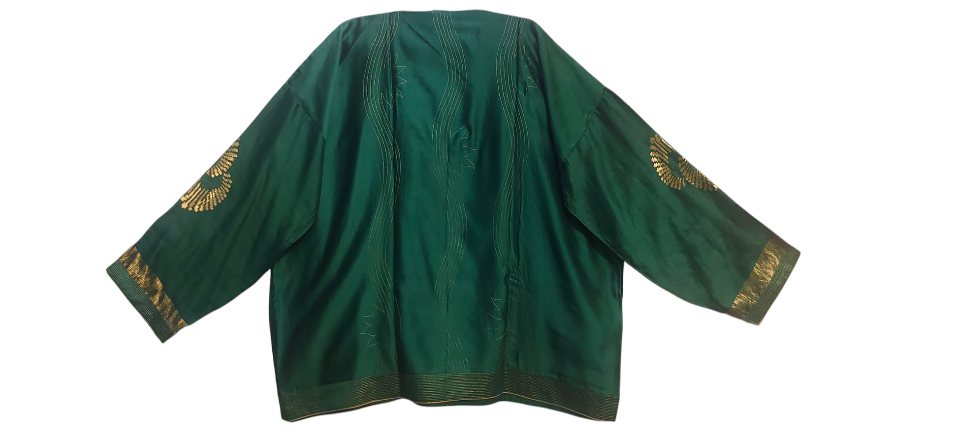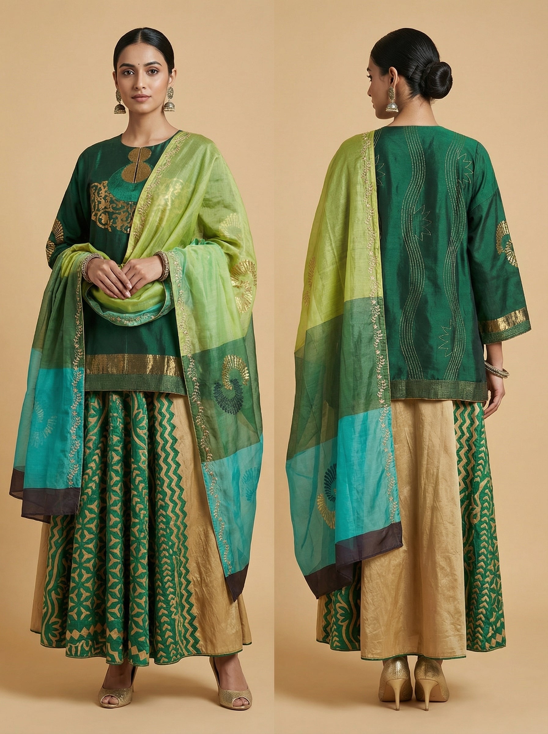 An elegant traditional Indian outfit featuring an ankle-length flared golden-beige silk skirt with intricate emerald green geometric and floral woven patterns and plain beige tissue back side of the skirt, paired with a matching dark green short waist length tunic showcasing gold brocade detailing, round gold appliqué at the chest, and metallic embroidery on sleeves and hem and gold textured stitchlines pattern on the back, styled with a sheer organza dupatta in colour block sections of lime green to aqua blue with scattered radial gold motifs and embroidered floral borders along the long edges