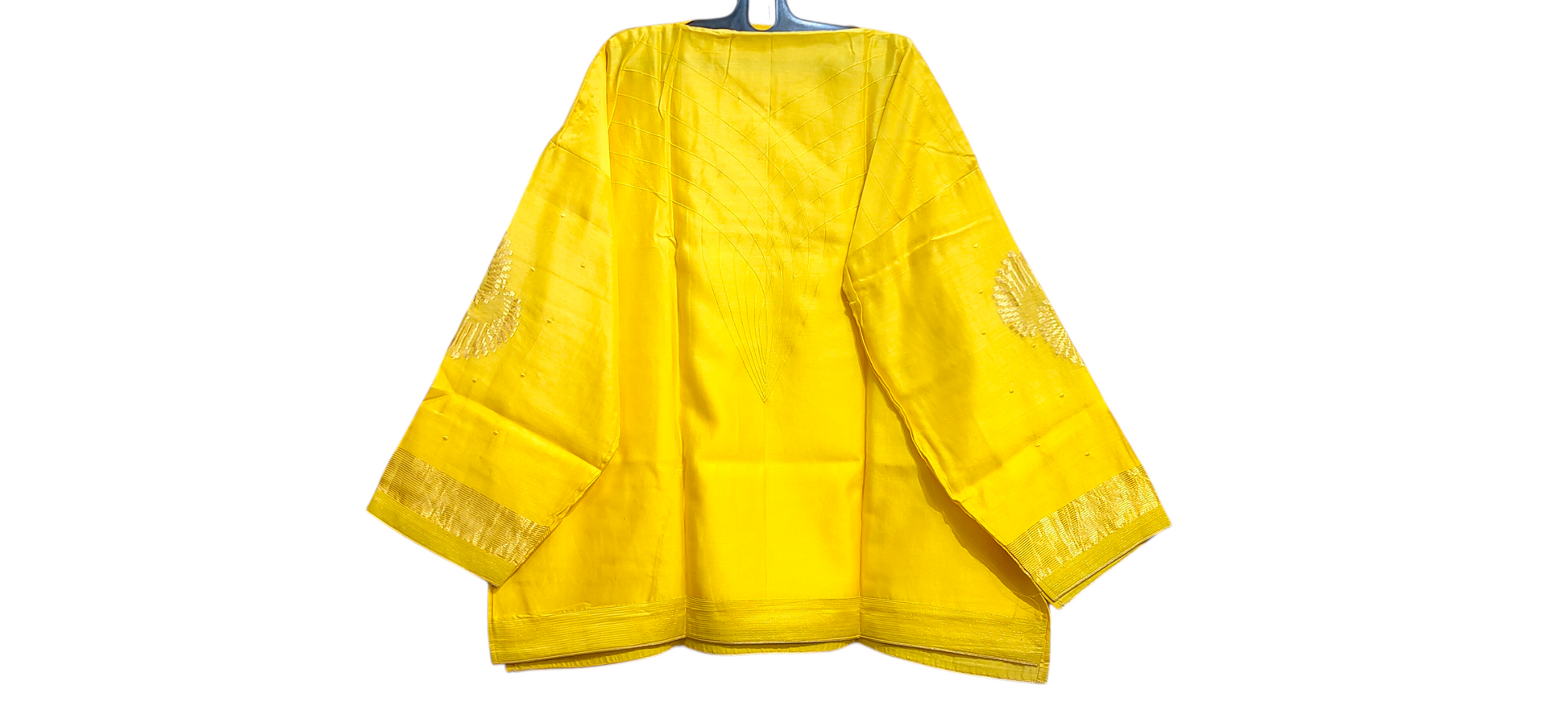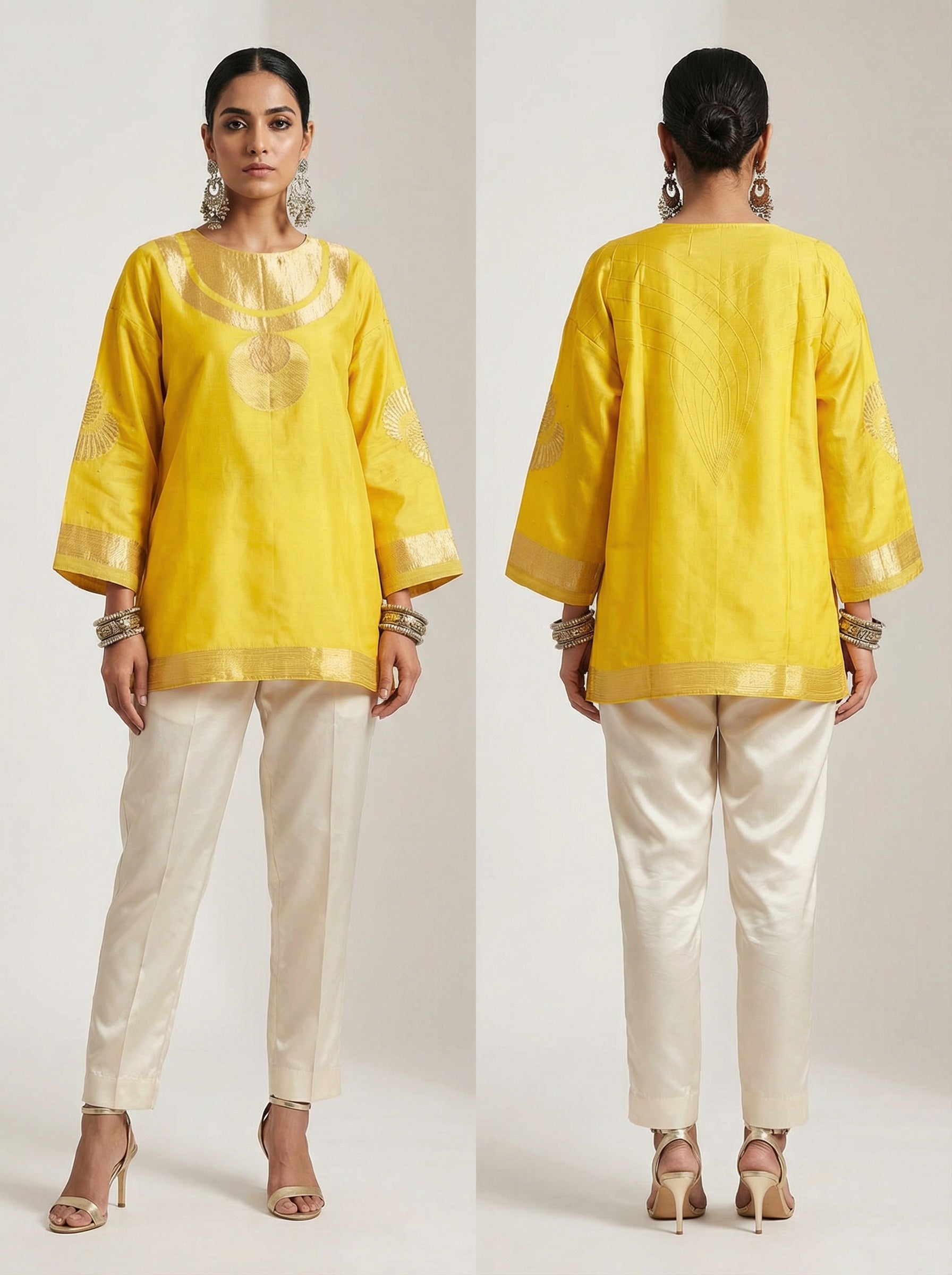 A cropped bright yellow silk tunic with wide full-length sleeves, featuring subtle geometric stitch detailing on the back, gold woven circular chest motif, and fan-shaped gold embroidery on the sleeves, finished with metallic gold cuffs and hem accents, styled in the look of a contemporary Indian designer fashion editorial, clean backdrop, bold poised stance.