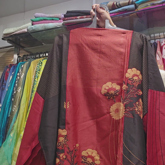 This exquisite semistitched short Kurta is designed in silk chanderi in contemporary styling with floral ajrakh applique placements on the front and back panels for an exclusive look. The sleeve panels are accented with unique detailing making it perfect for any indo western formal occasion.